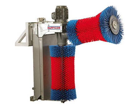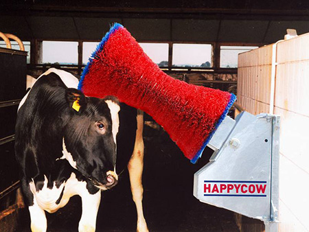 La machine à nettoyer les vaches se fixe au mur. Elle est constituée de 60 disques indépendants montés sur un vilebrequin et dont les diamètres de l'extérieur vers l'intérieur sont de plus en plus petit. Cette forme de brosse correspond particulièrement bien au corps de la vache laitière. Les éléments les plus avantageux sont la longue durée de vie de la brosse, sa disponibilité permanente de mise en marche et son faible coût d'entretien. Au contraire des machines à nettoyer les vaches traditionnelles, lorsque la brosse est usée, elle ne doit pas être changée en intégralité mais uniquement les disques usés doivent être remplacés par de nouveaux. De cette façon, tous les disques sont utilisables jusqu'à usure complète. Pour allonger la durée de vie de "Happy Cow", les pièces en métal sont en acier forgé et les angles et chaînes de traction, souvent sujets à problèmes, ont été évités. Un simple moteur à propulsion à roue hélicoïdale de 0,37KW ne nécessitant pas d'entretien fait fonctionner la machine, Un mécanisme pliable permet d'adapter la machine selon la taille de la vache.